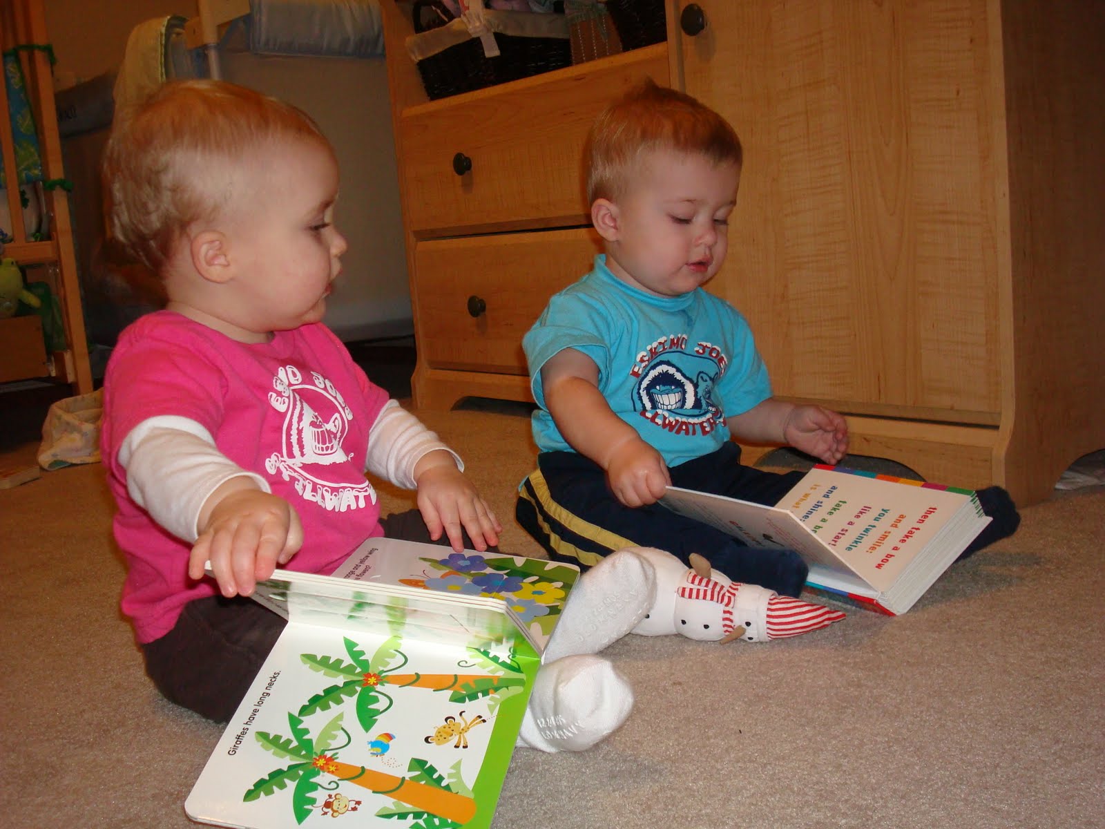 I have to brag a little bit about these kids. They are getting so fun and a whole lot easier. Ok, not brag but rejoice. They love books. That is such a good thing because we have a mini collection, but there is enough to go around. Toys- someone wants what another has and we don't buy three of everything so there tends to be bullying, usually from Tatum. Books provide good entertainment as well as learning.. I hope. So here are a few pics from two different occasions of them "reading". They are pretty awesome at flipping pages too. And if I start saying the lines from a book- they know to get that book, or something similar to. But that first pic of Linc cracks me up. He is such a cheeser for the camera... but after the smiles he just starts making the goofiest, kind of retarded faces. It is hilarious. What a character.